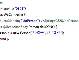 Spring JSON HTML ajax Spring Controller------------------------------------------> pom.xml에 JSON Converter추가 com.fasterxml.jackson.core jackson-databind 2.9.3 ※ Person이 하나가 아니라 여러 개면?Person p1, p2, p3;p1= new Person("길동", 13, "학생);p2= new Person("라임", 15, "학생);p3= new Person("주원", 17, "학생); List list = new ArrayList();list.add(p1);list.add(p2);list.add(p3);return list; =>[{"name":"길동","age":13,"..